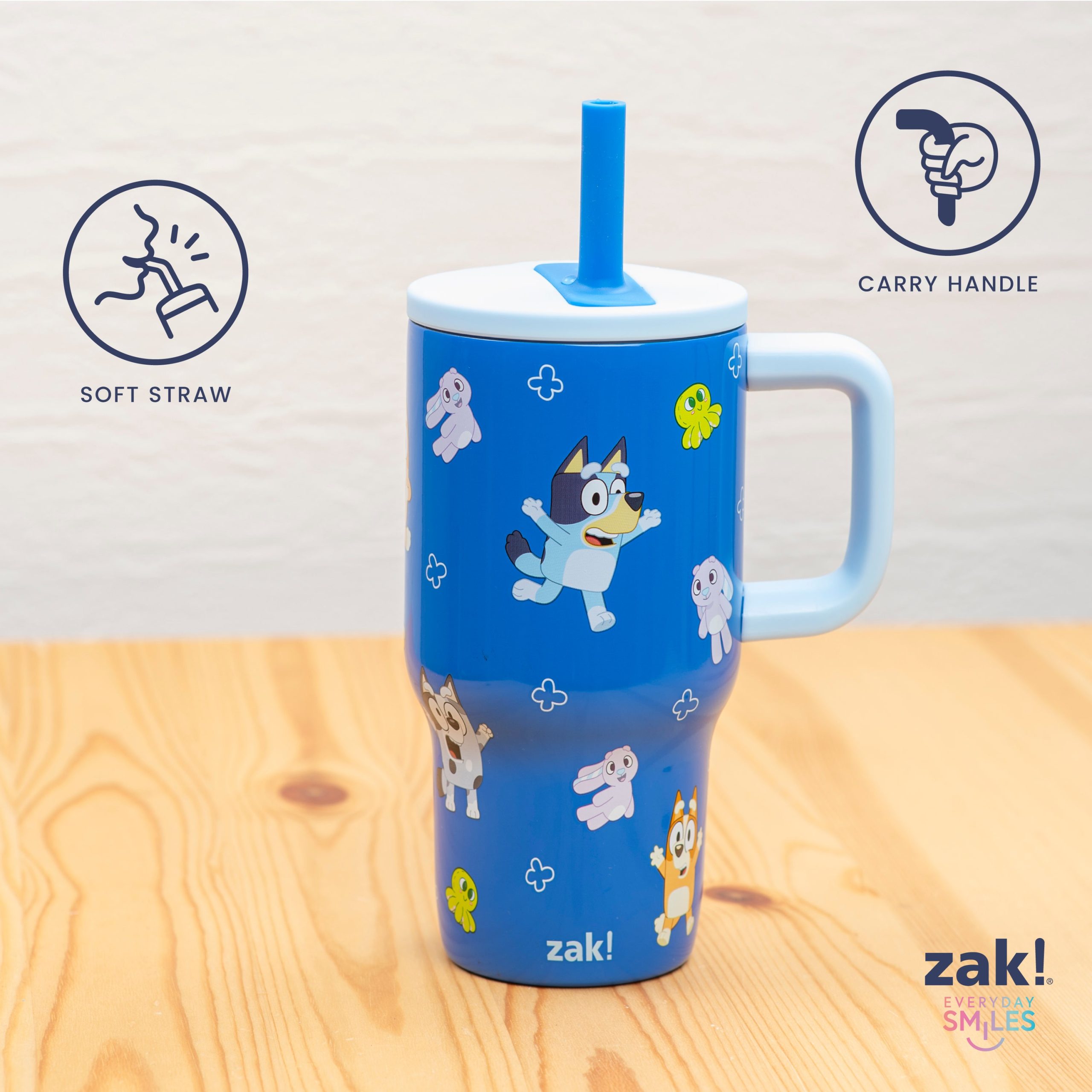 The 16-ounce Bluey tumbler is made of durable stainless steel. with vacuum insulation that keeps drinks fresh and cool while stopping condensation and water rings. It has a silicone straw that’s comfortable to sip from. as well as sealed to the lid to help prevent splashes and spills. When you’re on the go. the handle gives you a secure grip and the tumbler fits in most car cup holders. making travel easy and convenient. And at the end of the day. the durable stainless steel straw tumbler is top rack dishwasher safe for easy cleanup! Use it with kids age 3 and up for cold drinks only. and do not microwave.