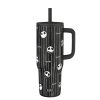 The 16-ounce Spider-Man tumbler is made of durable stainless steel. with vacuum insulation that keeps drinks fresh and cool while stopping condensation and water rings. It has a silicone straw that’s comfortable to sip from. as well as sealed to the lid to help prevent splashes and spills. When you’re on the go. the handle gives you a secure grip and the tumbler fits in most car cup holders. making travel easy and convenient. And at the end of the day. the durable stainless steel straw tumbler is top rack dishwasher safe for easy cleanup! Use it with kids age 3 and up for cold drinks only. and do not microwave.