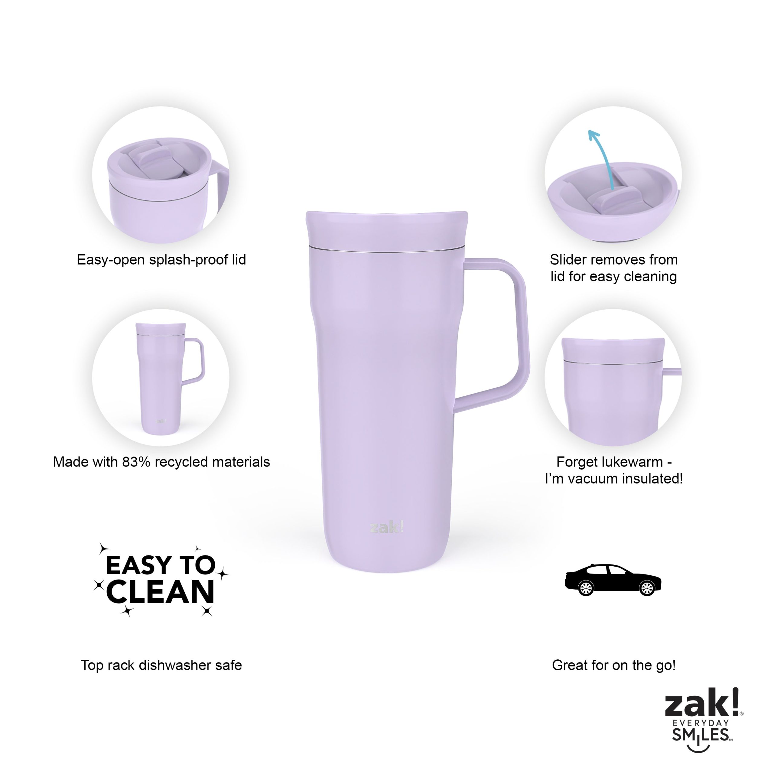 All reusable water bottles and tumblers help reduce waste. but the Harmony Tumbler goes even further by combining quality. functionality. and individuality into one sleek design. The wide handle allows you to carry it in comfort. and the slim shape fits easily into most car cup holders. so you can bring your favorite beverages anywhere your daily adventures take you.?Plus. the Harmony Tumbler from zak! features a slide lid that gives you easy access to your drinks while helping to prevent splashes on the go. When it’s time to clean up. the slider can be removed to reach every nook and cranny. and the lid and tumbler are top-rack dishwasher safe. It’s amazing how not having to compromise can put a smile on anyone’s face!