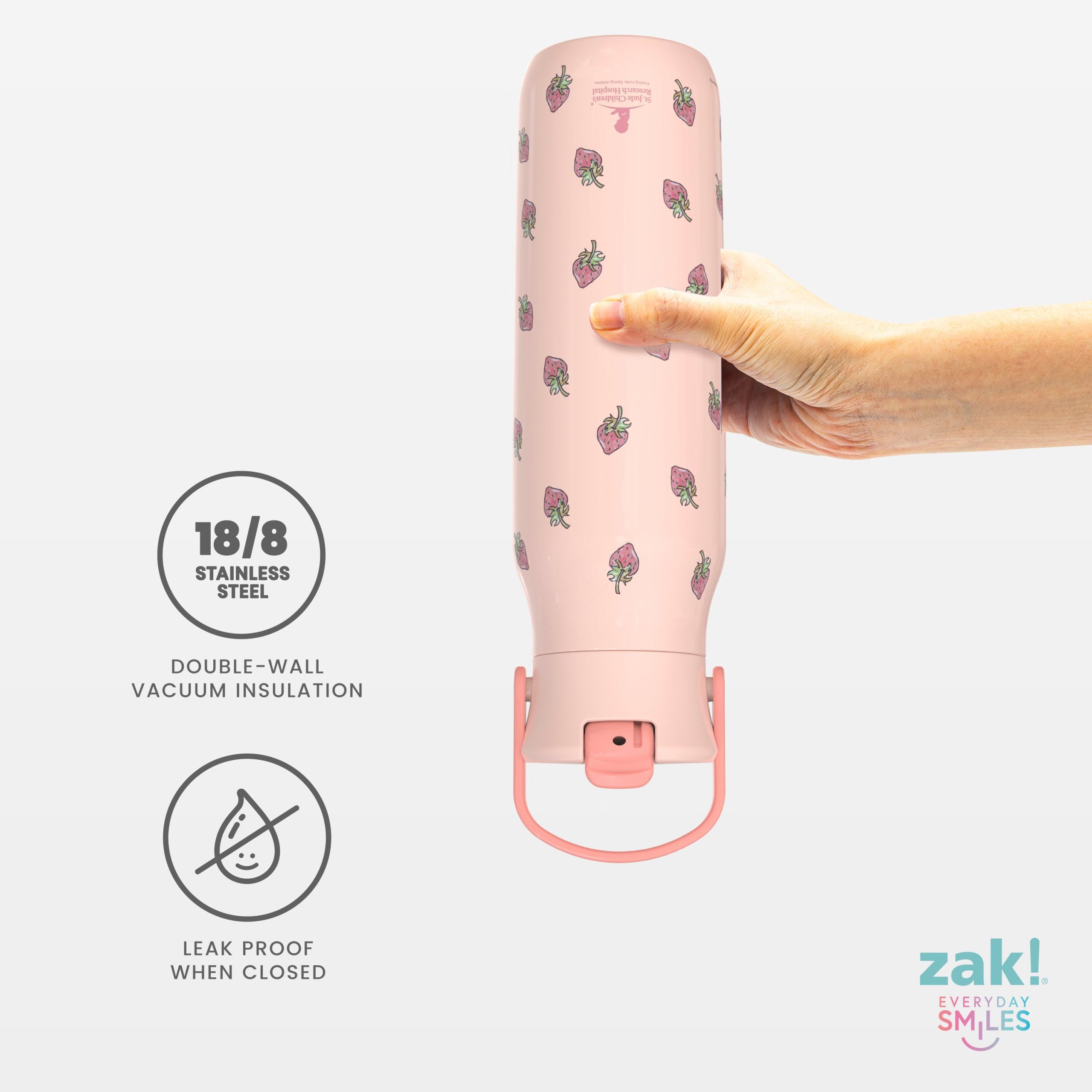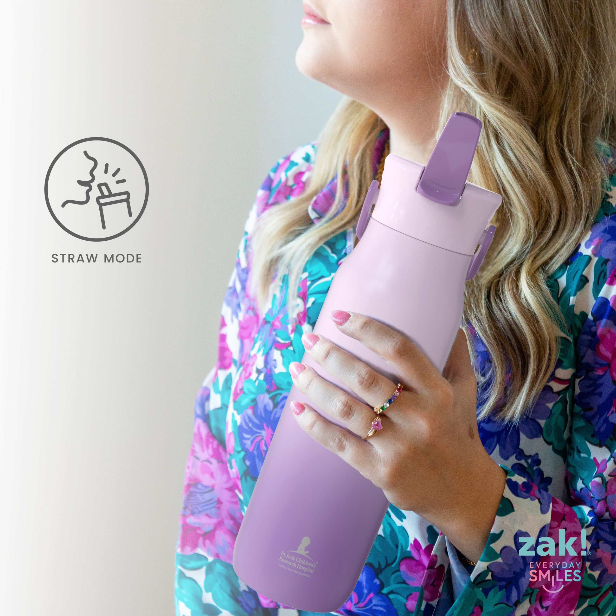 Zak Designs will donate 4% of the purchase price of this product to St. Jude Children’s Research Hospital® to support its mission: Finding cures. Saving children. ® Inspired by the art of patient Ty. the Harmony water bottle from zak! is made of stainless steel and built for any adventure. with easy cleanup in the top rack of the dishwasher at the end of the day. But. we didn’t just leave it at that. The 32-ounce Harmony bottle is packed with practical features like a robust carrying handle. a flip-up drinking spout to keep sipping simple. and vacuum insulation that’ll keep your water cold for hours. And since hydration doesn’t stop when you’re on the go. the sleek. unique design lets you carry your water around and look good doing it. Gettin’ your sips in with a smile on your face—it doesn’t get much better than that!