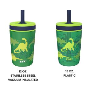 Let’s keep it simple: these Dino Camo tumblers don’t leak. The silicone sipper spout design has a built-in valve that stops water from flowing when no one is drinking: it’s easy for children to quench their thirst. but won’t make a mess if the tumbler is tipped over. It’s the perfect choice for active kids. or young ones just graduating from sippy cups who aren’t ready for an open-topped tumbler yet. Two tumblers and a bonus sipper are included in the set—the 12-ounce stainless steel tumbler has vacuum insulation. which keeps drinks cold and eliminates water rings from condensation. and the 15-ounce plastic tumbler is lightweight and easy to carry. They’re both durable. reusable. and completely BPA free.