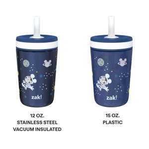 Let’s keep it simple: these Mickey Mouse tumblers don’t leak. The silicone sipper spout design has a built-in valve that stops water from flowing when no one is drinking: it’s easy for children to quench their thirst. but won’t make a mess if the tumbler is tipped over. It’s the perfect choice for active kids. or young ones just graduating from sippy cups who aren’t ready for an open-topped tumbler yet. Two tumblers and a bonus sipper are included in the set??the 12-ounce stainless steel tumbler has vacuum insulation. which keeps drinks cold and eliminates water rings from condensation. and the 15-ounce plastic tumbler is lightweight and easy to carry. They’re both durable. reusable. and completely BPA free.