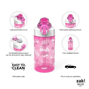 The 16-ounce Barbie water bottle is made of plastic. durable enough for kids to use every day and bring on any adventure. The lid screws on securely and won’t leak when the spout is closed. though water flows for easy drinking when the spout is open. It’s easy to release for quick access. and the button has a flip-up lock to keep it from activating accidentally. The drinking bottle fits in most car cup holders with a built-in carrying loop on the lid for easy transportation. and with the cover to keep the spout clean and closed. it can be tossed into a bag for worry-free travel.
