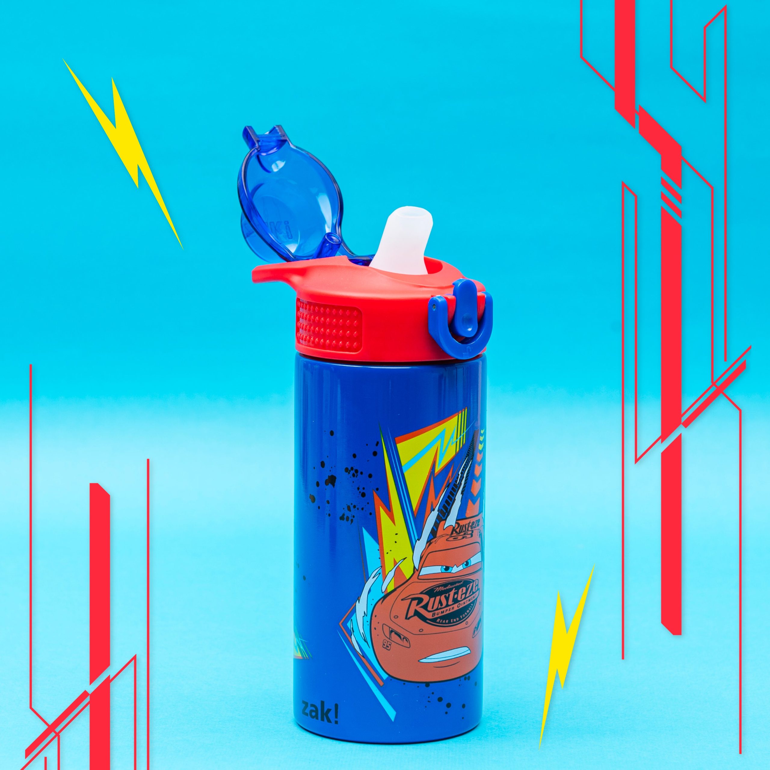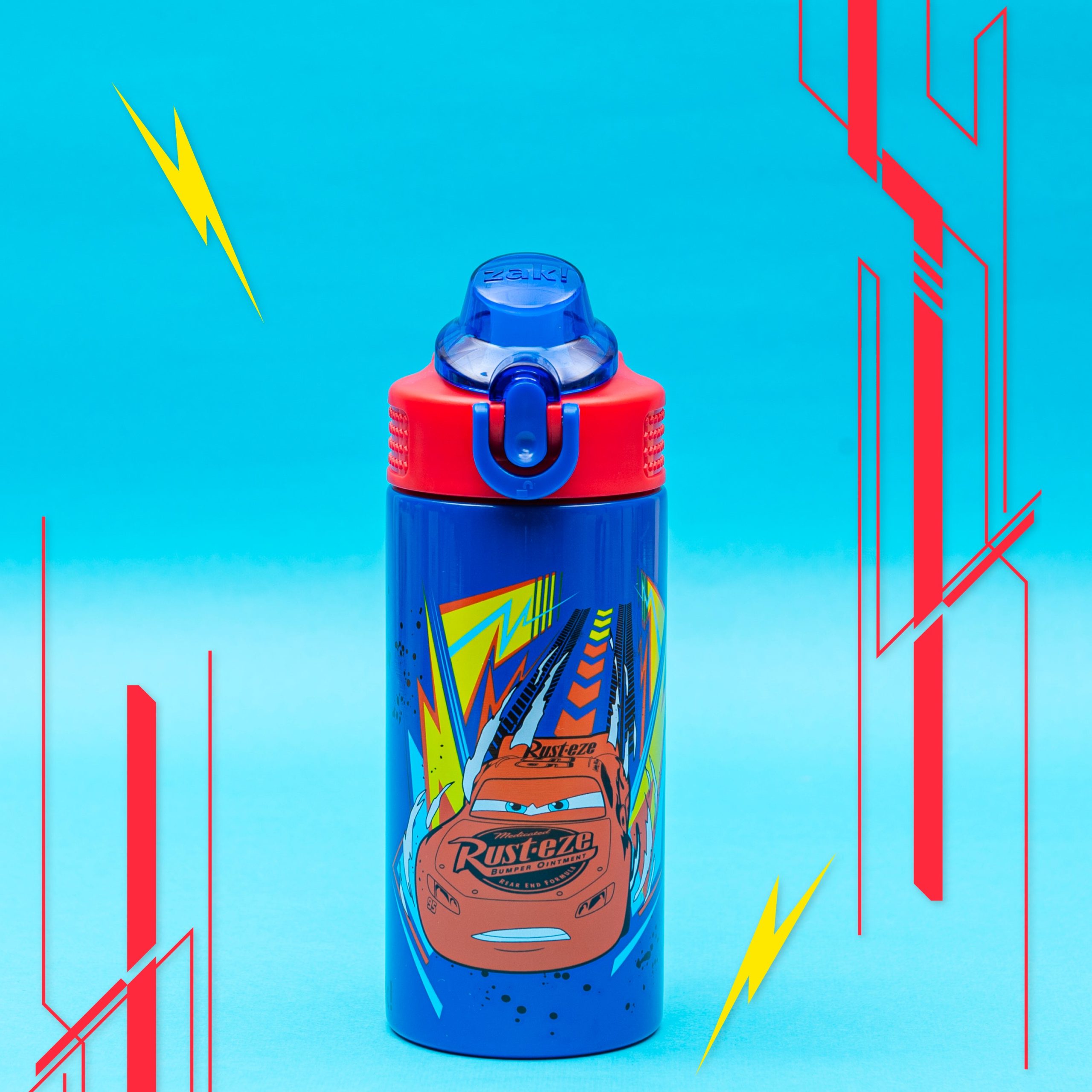 The Disney Cars 14-ounce water bottle is made of durable stainless steel. sturdy enough for kids to use every day and bring on any adventure. Vacuum insulation and double-wall construction will keep drinks cold for hours. while stopping condensation from leaving messy water rings. The lid screws on securely and won’t leak when the spout is closed. though water flows for easy drinking when the spout is open. It also has a quick-release button that makes water easy to access. and a flip-up lock to keep it from activating accidentally. The drinking bottle fits in most car cup holders with a built-in carrying loop for easy transportation. and with the cover to keep the spout clean and closed. it can be tossed into a bag for worry-free travel. At the end of the day. the lid is easy to disassemble for a thorough cleaning. and the water bottle is top rack dishwasher safe to simplify your routine. Use with cold drinks only and do not microwave.
